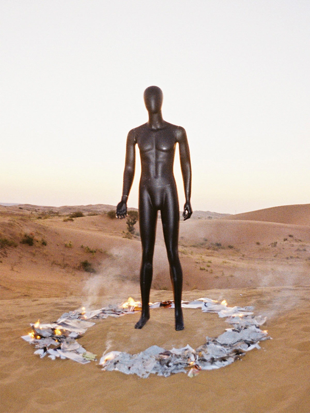 We try to extend the link between the world and ourselves. Exploring the depth of subconscious, elements of desert, waste, burning, hunting the witch, dehumanization, dystopia, Incarnation. We picture this scene of a post apocalypse ritual of burning around a mannequin to reincarnate. In the complete obsolete world of wasteland, human would find the boundary of different ideology more and more ambiguous.